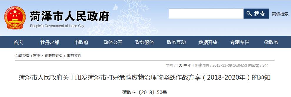 菏澤市人民政府關于印發菏澤市打好危險廢物治理攻堅戰作戰方案(2018-2020年)的通知